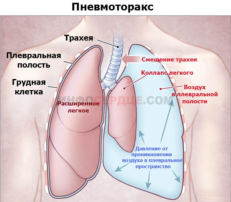 Кроме того, пневмоторакс может развиться в результате травмы или хирургического вмешательства в области грудной клетки.