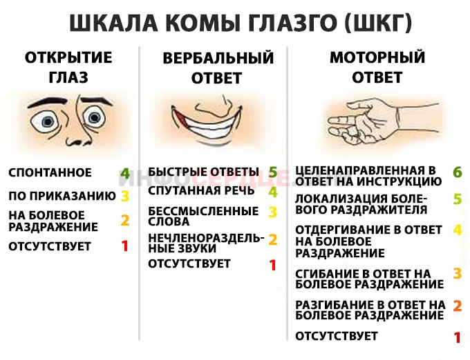 Шкала комы Глазго (ШКГ) позволяет оценить тяжесть состояния на основе неврологического дефицита (баллы варьируются от 3 до 15, где 15 — ясное сознание, а 3 — глубокая кома):
