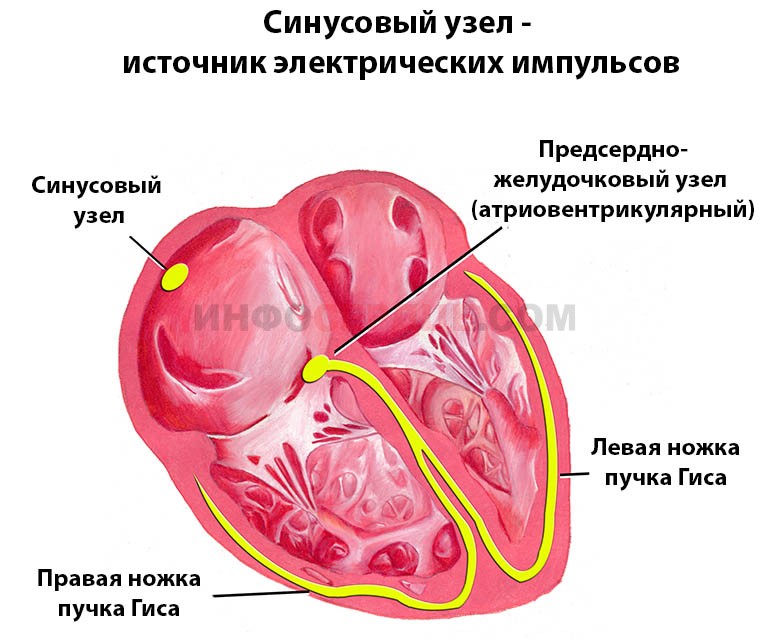 Основным источником электрических импульсов является синусовый узел, находящийся в стенке сердца. Он отвечает за равномерное сокращение миокарда, который является мышечным слоем сердца.